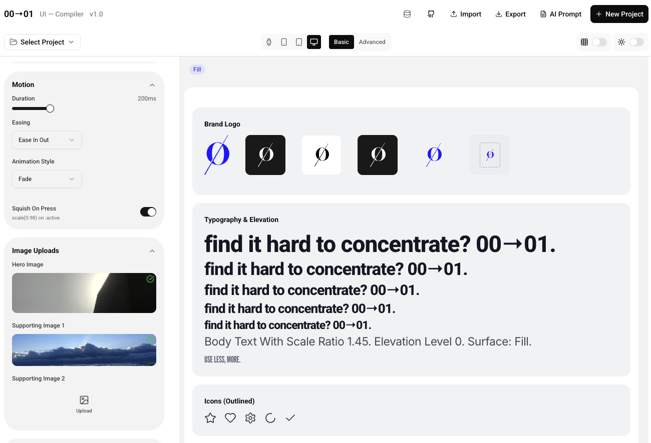 Teams building AI products often struggle with fragmented token systems, inconsistent UI patterns, and the "jibber-jabber" of over-complex handoffs. The ambition was to make a specialised tool—the UI Compiler—that simplifies the 0→1 journey for AI-first applications, ensuring absolute geometry and visual silence from the start.